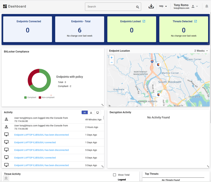 - Endpoints Connected is the count of Data Defense endpoints communicating to the console within the last 5 minutes.