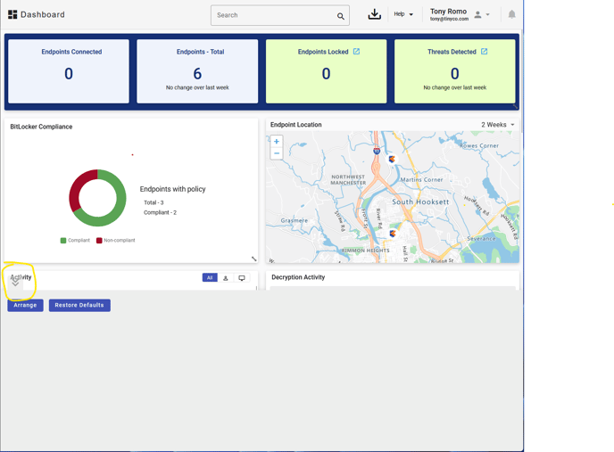 Each user can customize the dashboard view which will persist across logins. Simply grab the top of each widget to move it to a new location or bottom right to resize it. Click on the double up arrows at the bottom of the page to open a storage area you can drag widgets into if you hide them from view. The Arrange button will neatly layout widgets remaining on the page and Restore Defaults will set the dashboard back to its original state.