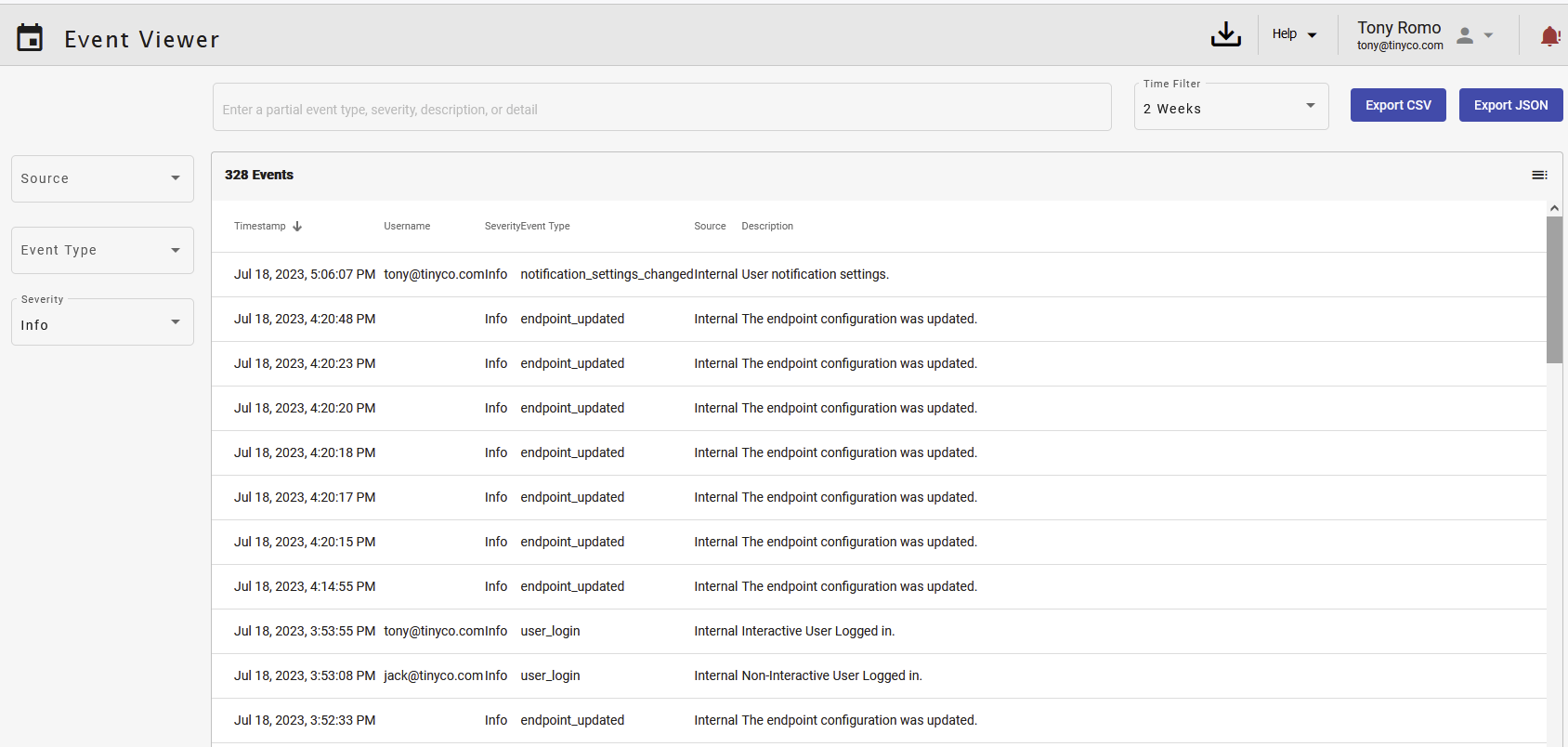The Event Viewer displays a history of console-based activity by users and integrations for the purposes of compliance reporting, forensics and troubleshooting.