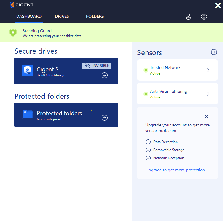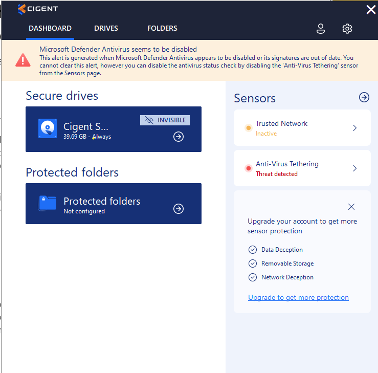 Minimize the Windows Security window and return to the Data Defense dashboard. Note that ActiveLock was immediately engaged. When Activelock is engaged, all Secure Drives will be locked and protected files will require authentication regardless of protection level.