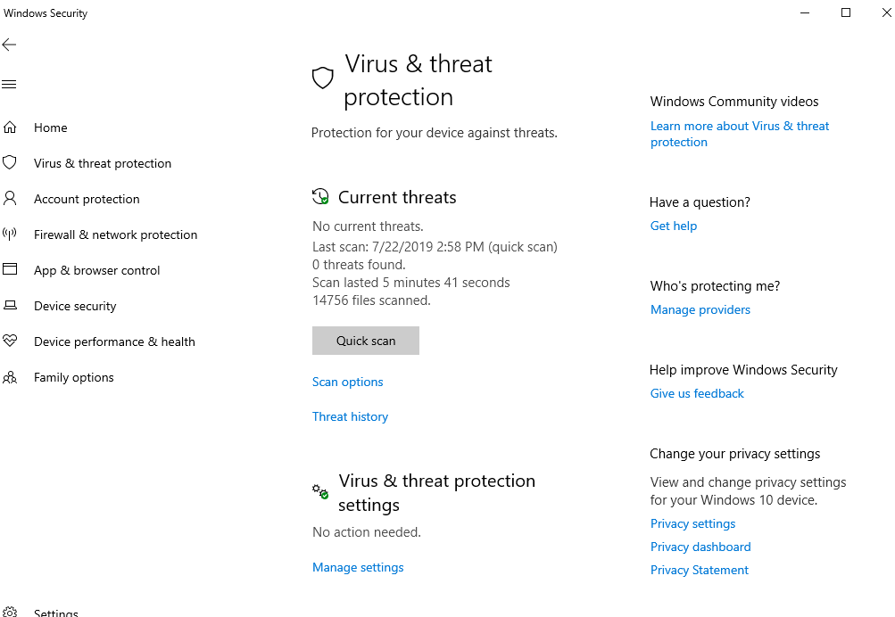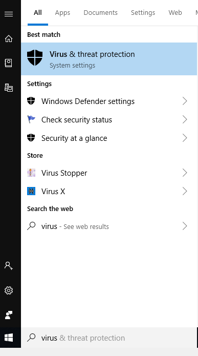 Search in the start menu for “Virus & threat protection”. Select the item to open System Settings.
