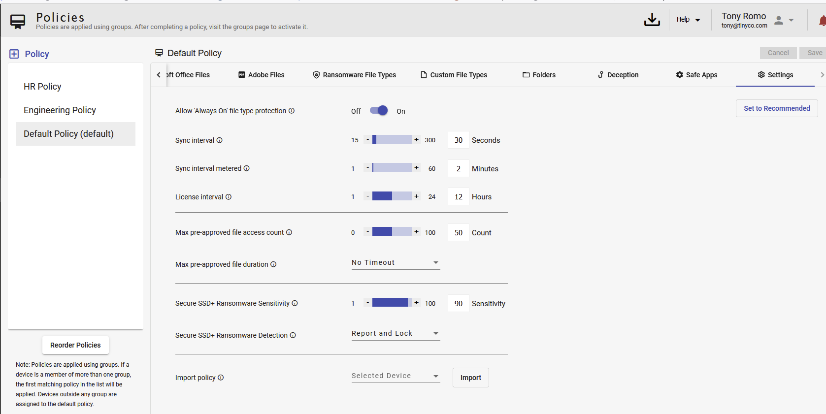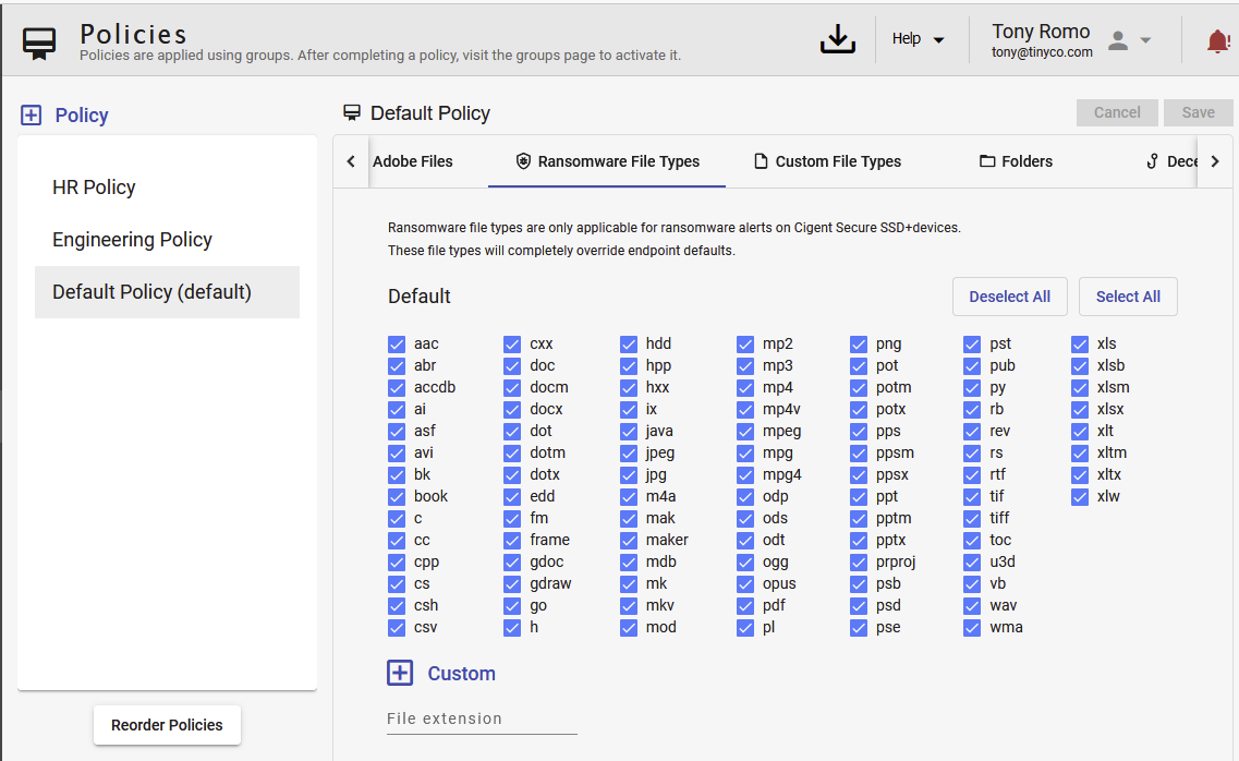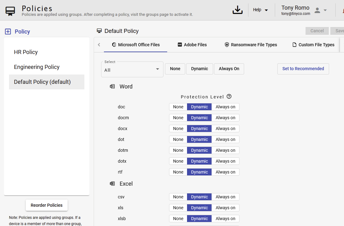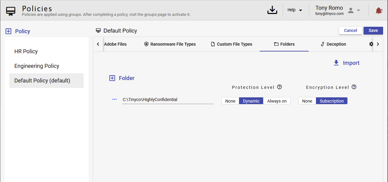 Policies enable administrators to enforce a minimum set of protections and Data Defense settings across a population of endpoints. Policies are associated to all members of a Group. The Default is automatically associated to endpoints that are not a member of any group. If an endpoint is a member of more than one group, the endpoint is associated to the policy highest on the list.