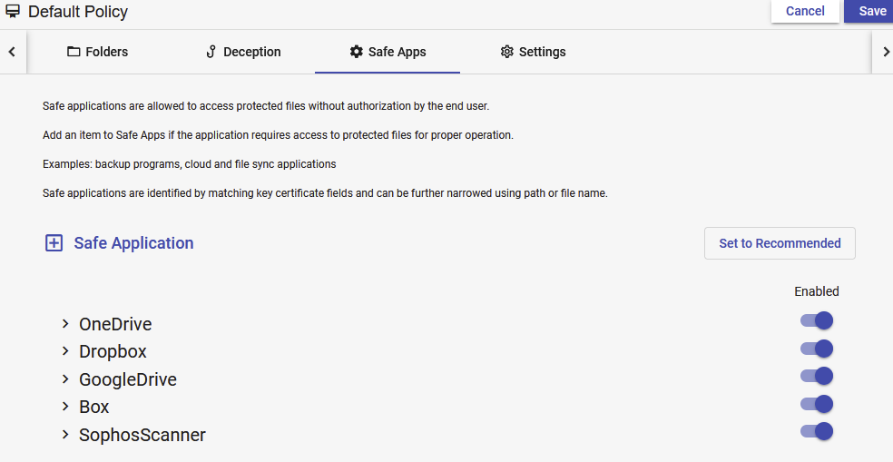 Safe applications are allowed to access protected files without authorization. Common usage of Safe apps include backup programs and cloud file storage applications.