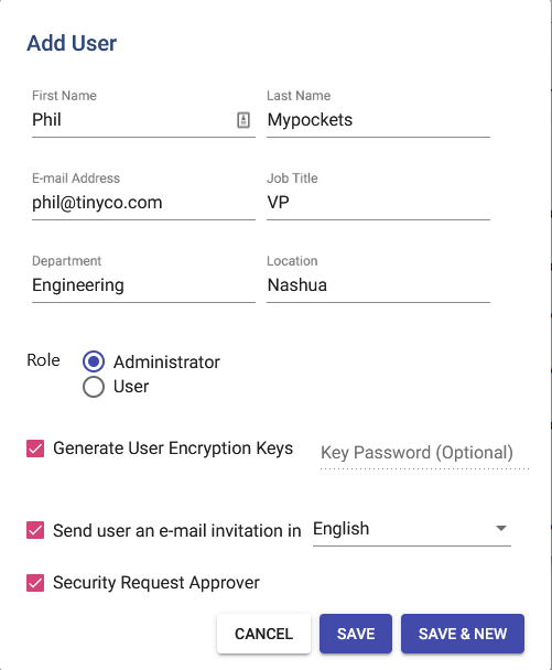 Security Request Approver if checked this user can approve Recovery key requests as well as the addition and removal of other Security Request Approvers. This user status must be approved by current Security Request Approvers.